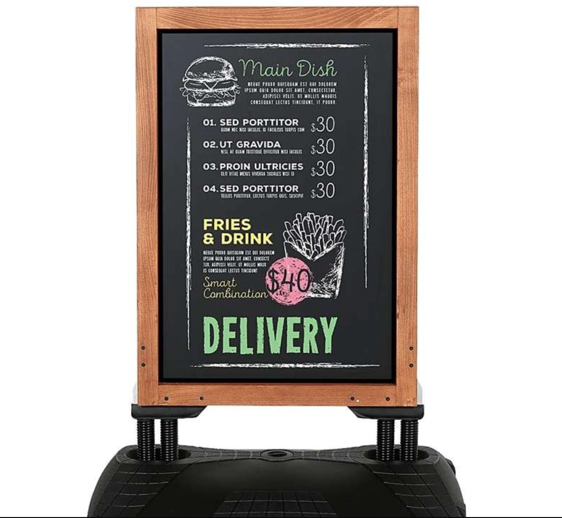 Dieser Kreidetafel-Kundenstopper kombiniert eine elegante Optik mit hoher Funktionalität. Der schwarze Metallrahmen wird durch einen attraktiv dunkel gebeizten Holzrahmen ergänzt – ideal für Gastronomie, Einzelhandel oder Events.